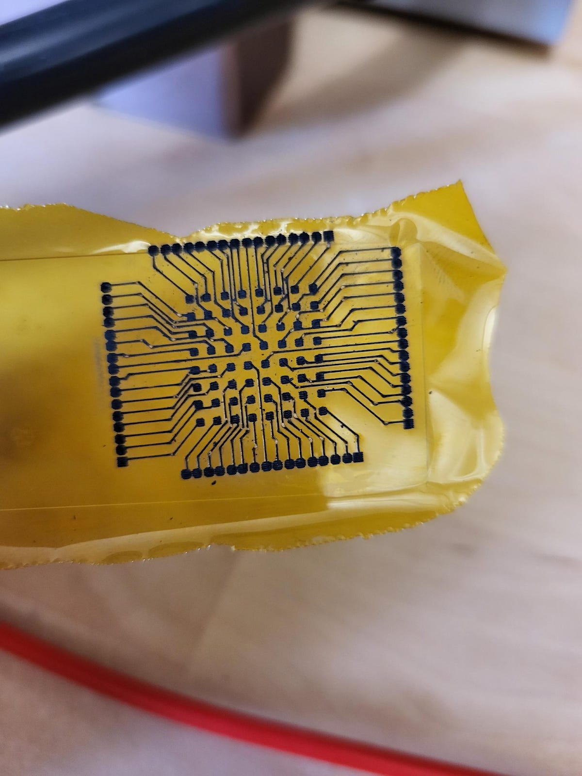 The biggest challenge so far is creating continuously conducting traces. In theory, we could just make the traces thicker. We increased the widths in SVGs (a set of lines defined in the XML format).1 However, in practice for SVGs, the laser software treats all lines as infinitely thin. We then tried the JPGs, which are bitmaps, however, the microchanges from 0.2 mm to 0.3 mm in the JPG was pathetically insignificant, leading to a fuzzy, shorted circuited image. A lazy hack we found was just to duplicating the traces three times in the laser software from xtool. Additionally, we varied the scan rate (+/- 20 mm/s) and lines per cm (max at 200, min at 50) and set the laser scanning to be monodirectional.