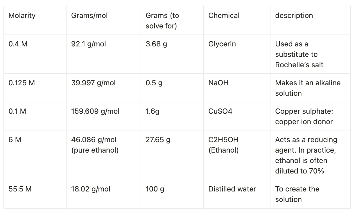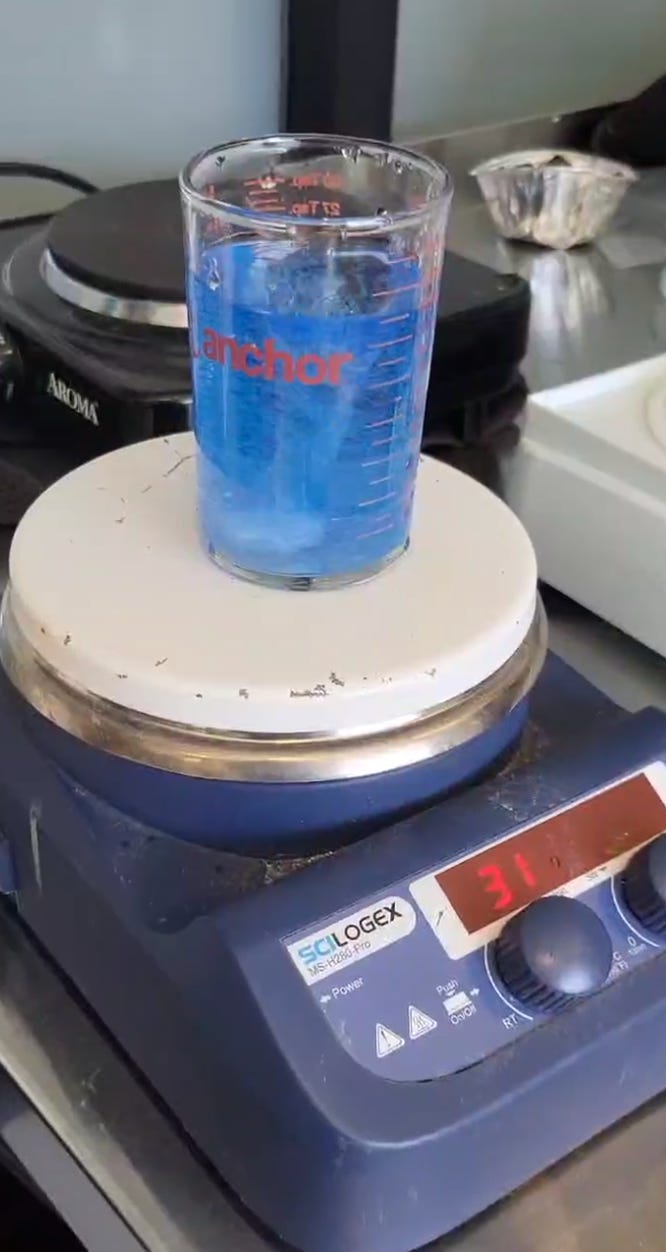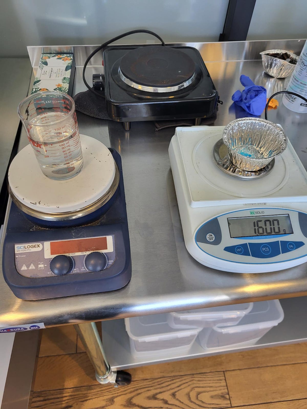 Add water first, and then go from least reactive to most. Make sure to add distilled water, followed by alcohol, glycerin, NaOH and then CuSO4. We placed the solvent on a hot plate, with a magnetic rod for stirring.