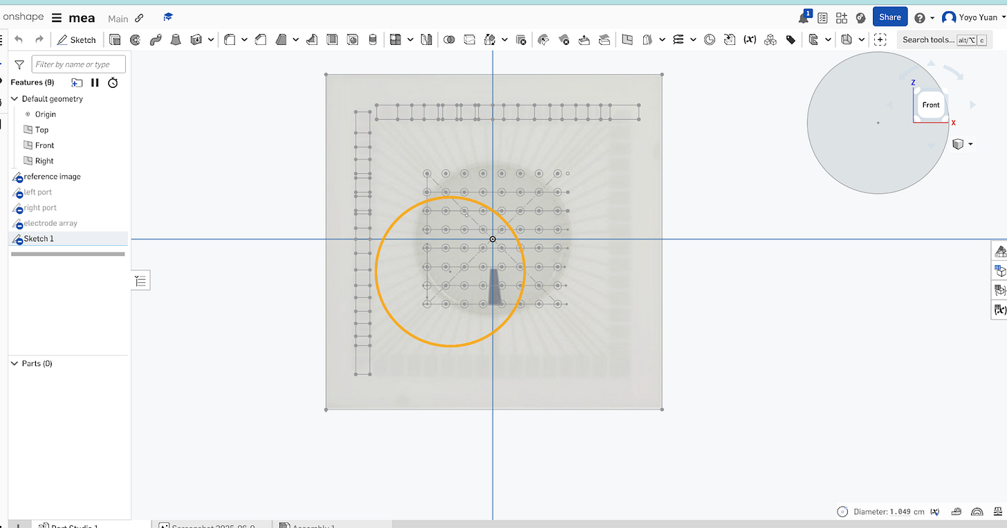 Essentially, the dot grid directly come into contact with neurons, and extend out to the peripherals. I made a mistake at first to draw the ring too conductively, which would undesirably connect all the electrodes together.