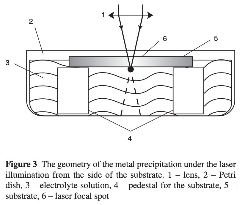 A focused laser beam is directed at the copper solution, causing heated surfaces at particular points and unheated surfaces. This creates a voltage difference like a battery. The heated area gains copper under the plate.
